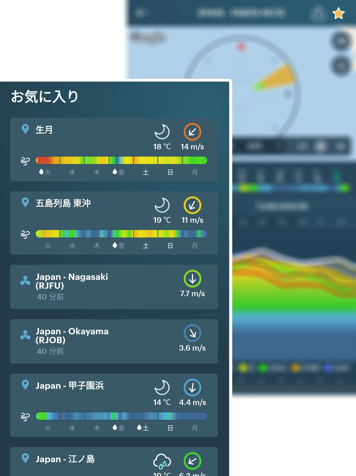 お気に入りの場所の簡易版予想と現在の風向きを表示します。お気に入りの場所またはウェザーステーションを追加できます。
