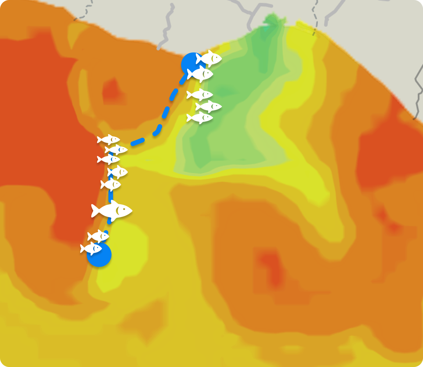 Look for temperature breaks — sharp color changes on the map. That's where baitfish gather — and predators follow.