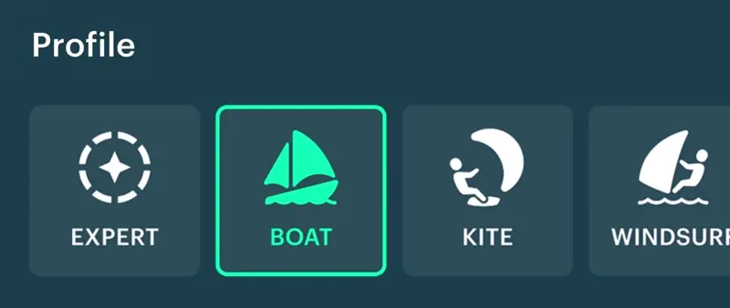 (BOAT in this example). You’ll see dozens of free Profiles — presets of weather parameters for different activities.